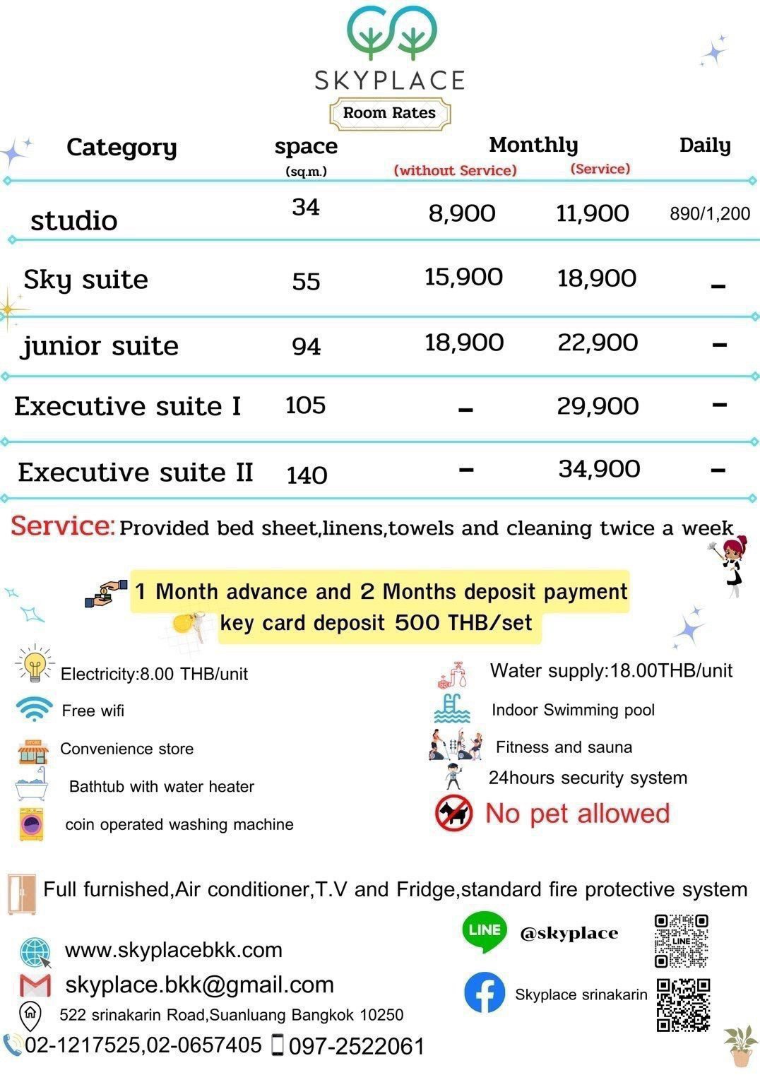 Rooms Room Amenities: Wi-Fi microwave fridge air conditioner wardrobe dining table TV dressing table locker STUDIO STANDARD ROOM Standard room size 34 square meters with full facilities. See More STUDIO DELUXE ROOM Deluxe room size 34 square meters with full facilities. See More SKY SUITE ROOM Room size 55 square meters decorated in modern style. with full facilities See More JUNIOR SUITE ROOM SUITE room size 94 square meters, fully furnished. See More EXECUTIVE SUITE I SUITE room size 105 square meters, fully furnished. See More EXECUTIVE SUITE II SUITE room size 140 square meters, fully furnished. See More